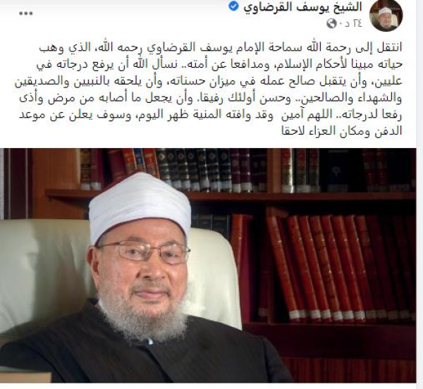 ونشر الحساب الرسمي للقرضاوي على موقع التواصل الاجتماع (فيسبوك)، "انتقل إلى رحمة الله سماحة الإمام يوسف القرضاوي الذي وهب حياته مبينا لأحكام الإسلام، ومدافعا عن أمته".