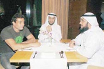 وقال العوضي: رأيت على الطاولة المجاورة عمرو دياب ومعه فريقه الموسيقي المصري، فطلبت من "النادل" أن يدعوه إلى طاولتنا فجاء سريعا وعانقني ليصير بيننا حوار ممتع طويل حول الدين والفن والشهرة والجمهور والجسد.