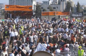 وعندما استقر الحضور داخل الملعب وعلى الأسوار، قدر العدد بنحو 10 آلاف، وهو عدد ضخم، لتظاهرة من هذا النوع، لم تشهدها رام الله من قبل، حتى وصف البعض المدينة التي يوجد فيها مقر رئيس السلطة الفلسطينية، بأنها تحولت إلى عاصمة للخلافة الإسلامية لعدة ساعات.