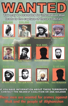 ووزع المنشور الذي يحمل صور وأسماء 12 مطلوباً من الحركتين مع جوائز تتراوح بين 20 ألفا إلى 200 ألف دولار، في أنحاء المناطق الشرقية من أفغانستان. ولا يتضمن المنشور الإعلان اسمي، زعيم تنظيم القاعدة أسامة بن لادن، الذي ترصد الولايات المتحدة جائزة قدرها 25 مليون دولار ثمناً لرأسه، أو الملا محمد عمر. وترصد واشنطن جائزة قدرها 10 ملايين دولار لمن يدلي بمعلومات تؤدي للقبض على الملا عمر. وتأتي الخطوة الاميركية عقب إعلان الرئيس الأفغاني حميد كرزاي استعداده للحوار مع قيادات طالبان ومنحها مناصب حكومية. وسارعت الحركة إلى رفض العرض ورهنت الحوار مع حكومة كرزاي بخروج القوات الأجنبية.
