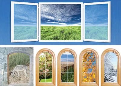 من الممكن أيضا معالجة النافذة على طريقة المنمنمات المجسمة. ويرى المعماري كريستوفر ميرز، صاحب شركة «جاست تيريسيز»، أن هذا الأسلوب جميل في إضفاء الجمال على النوافذ، وقال إنه تعلمه عندما كان يعمل في نفس المجال في شركة وولت ديزني ويونيفيرسال ستوديوز. وقال ميرز إنه صنع منمنمات مجسمة في استراحات الحدائق مثل تلك التي ظهرت في فيلم Pirates of the Caribbean في ديزني لاند بباريس، وأضاف معلقا أن المنظر يبدو وكأنه بيئة خارج المنزل، لكنه في الواقع مساحة بعمق قدمين. ويعتزم ميرز استخدام هذه التقنية لتغيير المشهد خارج نافذة مكتبه الجديد في صالة العرض بـ «جاست تيريسيز»، مشيرا إلى انه ينوى أولا الاستعانة بفنان تشكيلي لدهن الجدار ورسم شخص يقود دراجة عبر الريف الفرنسي. كما يعتزم أيضا وضع صندوق نباتات مملوء بقطع الخشب لإيجاد مشهد أقرب إلى مشهد الأفق في اللوحة. ويقول ميرز إنه اختار قطع الخشب في صندوق النباتات لأنها تتطلب كمية ماء أقل ويبقى النبات مخضرا طوال العام، ويقترح أيضا شجر الأرز واللبلاب. إذا لم تدهن الجدار المقابل لنافذتك، ربما تفكر في ملاذ بيئي على مستوى أقل في حوض أو تحت غطاء زجاجي على عتبة النافذة. ويمكن من خلال تربة النباتات الصغيرة أو القواقع أو الأحجار جذب الانتباه. ويمكن مزج كل هذه الأفكار بشرط أن تطبق بالطريقة الصحيحة، أي لا يجب أن يرمي الشخص بعض أوعية نباتات الزينة على عتبة النافذة ويفكر انه أوجد بعدا جديدا للمكان.