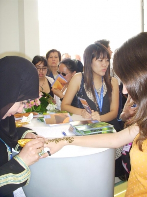شهد جناح الامارات في معرض اكسبو سرقسطة الدولي 2008 اقبالا كبيرا من الزائرات للنقش بالحناء علي ايديهن , ولا تكاد تري سيدة او فتاة تصل الي الجناح المتالق في سرقسطة دون ان تحصل علي نقش جميل من الحناء علي يدها.