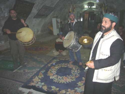 ويضرب ثلاثة منهم على الطبل، ويدق آخرون الكوؤس لتنساب أصواتها في المكان الذي يجاور الزاوية ويعتقد أنه مقاماً للخضر.