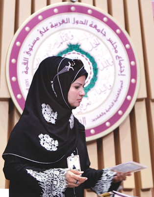 موظفة استقبال تقف أمام شعار القمة العربية في الدوحة