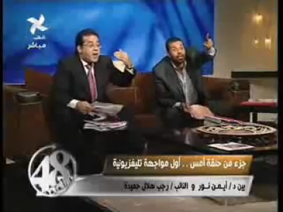 علق الاعلامي سيد علي في 48 ساعة على المناظرة الت أجراها البرنامج مساء الخميس الماضي بين القطبين المعارضين النائب رجب هلال حميدة سكرتير حزب الغد والدكتور ايمن نور رئيس ومؤسس حزب الغد ..