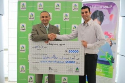 أعلنت شركة الاتصالات الخلوية الفلسطينية "جوال" إحدى شركات مجموعة الاتصالات الفلسطينية، عن الفائز بالجائزة الكبرى لمسابقة "سوبر مسابقات"، والبالغة قيمتها خمسون ألف دولار.