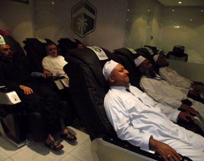 ويسترخي الحاج أو المعتمر على كرسي التدليك لمدة أربع دقائق، قابلة للتمديد لكبار السن لأربع دقائق أخرى.