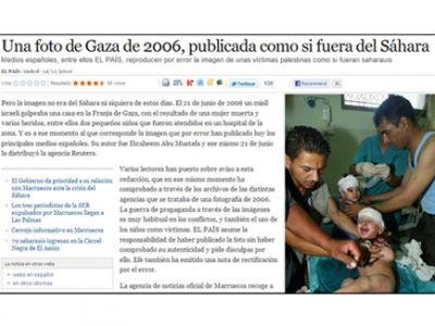 من الصور واحدة نشرت قبل يومين في معظم الصحف الإسبانية على أنها لطفلين صحراويين أصيبا بجروح من رصاص الشرطة المغربية في مدينة العيون هذا الأسبوع، في حين أنها لطفلين فلسطينيين أصيبا بجروح عام 2006 أثناء قصف إسرائيلي على غزة.