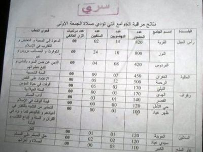 كما أظهرت وثيقة تحت عنوان: "نتائج مراقبة الجوامع التي كانت تؤدي صلاة الجمعة الأولى" بمناطق الرفراف, العالية, مثلين, رأس الجبل, وغار الملح من محافظة بنزرت شمال تونس، تقريرا مفصلا لأسماء الجوامع وعدد مرتاديها بشكل مقسم يضم "سلفيين" و"نهضويين " و"مرتديات لزي طائفي" فضلا عن فحوى خطب أئمة الجمعة بشكل تفصيلي دقيق.