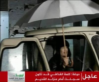 ظهر الزعيم الليبي معمر القذافي على التلفزيون الليبي يحمل شمسية واقية من المطر جالسا بسيارة جيب عسكرية ليثبت للناس انه ما زال موجودا في ليبيا.