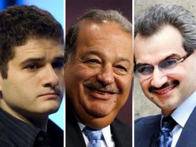 قائمة العشرة الأكثر ثراءاً في العالم وما زال الأمير السعودي، الوليد بن طلال، يحتل المرتبة الأولى بين أصحاب المليارات العرب، فقد بلغت ثروته التي وضعته في الدرجة الـ26 عالمياً هذا العام 19 ملياراً و600 مليون دولار، بعد أن كان في الدرجة الـ19 العام الماضي وبثروة كانت 19 ملياراً و400 مليون دولار، أي أن صاحب "شركة المملكة القابضة" ربح 200 مليون دولار فقط العام الماضي.