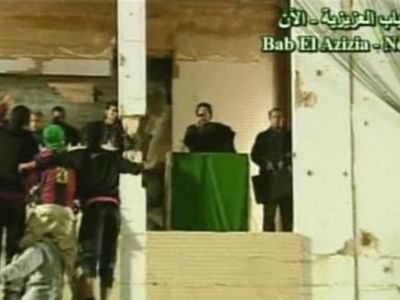 وقال لانصاره وهم يلوحون باعلام خضراء "أنا باق هنا وبيتي هنا انا باق في خيمتي"، وتبع الكلمة اطلاق العاب نارية في العاصمة الليبية وسمعت الحشود وهي تهتف وتطلق النار في الهواء في وسط المدينة.