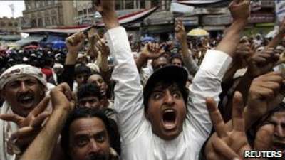 جاء ذلك فيما توجه آلاف المعتصمين بساحة التغيير في صنعاء في مسيرة غاضبة باتجاه جسر الزبيري تنديدا بقتل المتظاهرين في تعز ورفضا للمبادرة الخليجية.