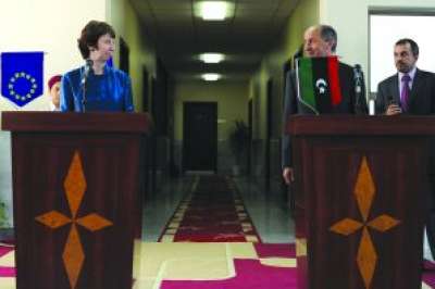 وعدت وزيرة خارجية الاتحاد الأوروبي كاثرين آشتون الثوار الليبيين باستمرار دعم أوروبا لهم، خلال زيارة أمس هي الأرفع لمسؤول دولي إلى بنغازي، معقل الثوار في شرق ليبيا، حيث دشنت مكتباً تمثيلياً للاتحاد.