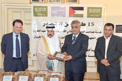 سُلمت في مقر سفارة خادم الحرمين الشريفين في العاصمة اللبنانية بيروت، شحنة التمور المهداة من الأمير سلطان بن عبد العزيز آل سعود، ولي العهد نائب رئيس مجلس الوزراء وزير الدفاع والطيران والمفتش العام، البالغ وزنها خمسة عشر طنا، إلى سكان المخيمات الفلسطينية في لبنان. وجرى التسليم في حضور سفير خادم الحرمين الشريفين لدى لبنان علي بن سعيد عواض عسيري، والقائم بأعمال السفارة الفلسطينية لدى لبنان محمود الأسدي، ومدير وكالة الأمم المتحدة لغوث وتشغيل اللاجئين الفلسطينيين في الشرق الأدنى (الأونروا) لدى لبنان سلفاتوري لومباردو.