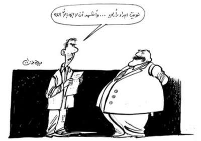 جاءت أعمال رسام الكاريكاتير السورى على فرزات فى أغلبها مهمومة بالسياسة والثورة، معبرة عن الحالة التى يعيشها النظام السورى فى ظل حكم الطاغية بشار الأسد، وفى إحدى اللوحات رسم فرزات شخصا ينوى أن يقول رأيه صراحة أمام السلطة، ولكنه ينطق الشهادتين أولا، كتعبير أن الموت مصير من يقول رأيه فى سوريا.