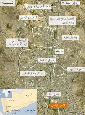 اشتباكات عنيفة اندلعت الأربعاء بين القوات الموالية للرئيس على عبد الله صالح والقوات المنشقة في محيط القصر الجمهوري في صنعاء ، وذلك عقب مهاجمة المدخل الجنوبي لساحة التغيير والفرقة المدرعة الاولى بعدة قذائف هاون وآربي جي وشوهدت أعمدة الدخان تتصاعد في مواقع الإشتباكات كما سمعت أصوات طلقات المدفعية والأسلحة الرشاشة.