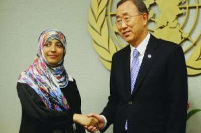 استقبل الامين العام للامم المتحدة بان كي مون أول من أمس الناشطة اليمنية توكل كرمان الحائزة على جائزة نوبل للسلام وأبدى قلقه من تدهور الوضع الاقتصادي والانساني في بلادها.
