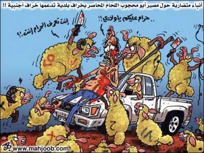 في محاكاة ساخرة لحادثة اعتقال وقتل الزعيم الليبي معمر القذافي ،واجهت شخصية ابو محجوب الاردنية التي ابتدعها الفنان عماد حجاج المصير نفسه . وفي كاركاتير جديد لابو محجوب الذي تقمص دور لحام اضاحي في العيد،أظهر الرسم الساخر الشخصية الهزلية وهي تستنجد من قطعان خراف هاجمتها .