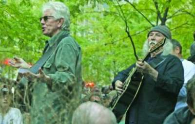 وعلى رغم أن عدداً كبيراً من المعتصمين في الساحة لم يكونوا ولدوا بعد، عندما سجلت فرقة «كروسبي ستيلز أند ناش» أكبر نجاحاتها كرمز للثقافة المضادة في نهاية الستينات من القرن العشرين، إلا أن الجموع شاركت بحماسة في الحفلة التي أقيمت في الهواء الطلق وتضمنت خمس أغان.