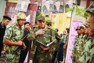 ميدانياً، كان لقوات الجيش «اليد الطولى» في السيطرة على اللجان وضبط الأمور، وتوارت الشرطة عن المشهد، ما رفع الثقة في قدرتهم على السيطرة على الأمور. فأمام إحدى لجان وسط القاهرة، اصطف جنود الجيش بزيهم المعروف منذ الساعات الأولى لصباح أمس قبل افتتاح اللجنة أمام المقترعين، بعضهم يحمل السلاح وآخرون يتسلحون بالعصي والدروع، فيما كان ضابط برتبة رائد يوجههم بكلمات حاسمة: «لا حديث مع الناخبين... يجب أن يمر اليوم بسلام... من يحمل بطاقة (هوية) يدخل إلى لجنة الاقتراع، ومن لا يحملها نوجهه باللين».