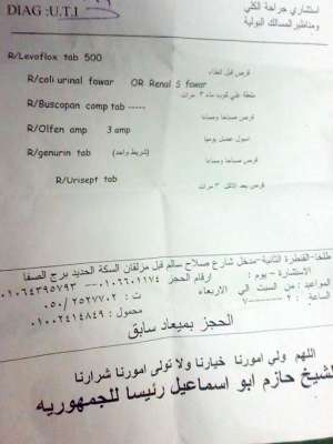 ذهب أحد المرضى لتوقيع الكشف الطبى عند الدكتور "سيد.ش" استشارى جراحة الكلى والمناظير" بمدينة طلخا، وبعد أن تم الكشف علية فوجئ بكتابة الروشتة ومدون عليها فى أسفلها، اللهم ولى أمورنا خيارنا ولا تولى أمورنا شرارها "وبخط كبير" الشيخ حازم أبو إسماعيل رئيسا للجمهورية.