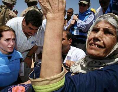 وتعمل جولي منذ ثمانية أعوام كسفيرة للنوايا الحسنة لدى المفوضية العليا لشئون اللاجئين التابعة للأمم المتحدة وقد التقت في وقت سابق باللاجئين الفلسطينيين الفارين من بغداد الى مخيم الوليد الصحراوي على الحدود العراقية السورية بعد تهجيرهم من قبل الميليشيات المدعومة من ايران, ونقلت حينها الفضائيات والوكالات الدولية لقطات باكية لجولي في الصحراء وهي بجوار امرأه فلسطينية مُقعدة طاعنة بالسن.