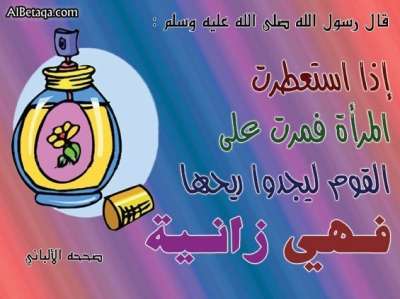 قال رسول الله صلى الله عليه وسلم : (( كل عين زانية , والمرأة إذا استعطرت فمرت بالمجلس فهي زانية )) وفي رواية (( أيما امرأة استعطرت فمرت على قوم ليجدوا منها ريحاً فهي زانية ))صحيح أبوداود وأحمد والترمذي والنسائي .