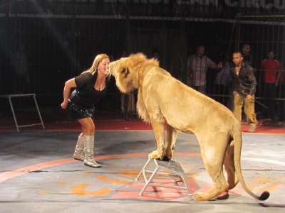 فى مهرجان السيرك المصرى الاوروبى فاتن الحلو تفاجىء جمهور نادى الشمس بفقرة الرقص مع الاسود فى اطار تطويرها لاخطر فقرات السيرك المصرى الاوروبى انهت رائدة ترويض الوحوش المفترسه فاتن الحلو بروفات تدريب اسودها على فقره جديده ضمن الفقرات التى تقدمها لجمهورها بالمقرالرئيسى الدائم والوحيد بنادى الشمس الرياضى تحت عنوان " الرقص مع الاسود " و تعتبرهذه الفقرة هى الخطوه الثانيه بعد ان قامت بتدريب الفنانين الروس على الرقص مع الثعابين العاصره وفى اطار حديثها اكدت " فاتن الحلو " قائله فقرات الوحوش المفترسه من الفقرات التى تعد الاخطر من نوعها فى تاريخ فن السيرك ولذا نكون حريصين فى الاقدام على تقديم اى فقرة جديده خاصة فيما يتعلق بالاسود والتى يتم تدريبها منذ الطفوله على تقديم فقراتها للجمهور الذى تعود ان يشاهد قفزها من بين النيران او تقديمها لفروض الولاء والطاعه بتقديم تحيه للجمهور مع بعض فقرات المشاغبات التى تحدث بينى وبين الاسود والنمور داخل القفص الحديدى وقد اخذ الاسدين " سعد وعلاء " فترة تجاوزت الشهور الثلاث لقبولهم بفكرة الرقص امام الجمهور وقد وقع الاختيار على هذين الاسدين بالتحديد بعد شهرتهمها العربيه التى حظيا بها من خلال مشاركتهم فى البرنامج الكوميدى " رامز قلب الاسد " فى رمضان الماضى ودائما ما اقوم باصطحابهم فى كبرى المهرجانات المحليه والعربيه التى كان اخرها مهرجان الدوحه بارك بدولة الامارات الشقيقه ومحافظة دمنهور بالقاهره ولحرص مجلس ادارة السيرك المصرى الاوربى على تقديم كل ما هو جديد فى فن السيرك فى المقر الرئيسى الدائم والوحيد بنادى الشمس الرياضى فقد تقرر تقديم هذه الفقرات الجديده الى جانب اثنى عشر فقره يقدمها نجوم فن السيرك من مختلف بلدان العالم من مصر وروسيا والارجنتين وفرنسا والصين ونظرا للاقبال الشديد قررت نائب رئيس مجلس الاداره دهب ابراهيم الحلو استمرار تقديم ثلاث حفلات يوميا تبدا ببرنامج الحفلات الصباحيه للمدارس فى تمام العاشره صباحاوالثانيه فى الخامسه والثالثه فى الثامنه مساء على جانب كانت الفنانه فاتن الحلو قد قامت بتحذير جمهور وعشاق السيرك المصرى الاوروبى الذى يحمل خلف ظهره تاريخا مشرفا من وجود بعض الجهات التى تقوم باستخدام اسمها لتقديم فعاليات ومهرجانات داخل مصر وخارجها مشيرة الى عدم وجود اى متحدث باسمها او باسم مؤسستها الفنيه سواها واكدت انها لا تمتلك فروع اخرى لها سوى فرع دمنهور والاسكندريه والتى تقدم عروضها فى مواسم يتم الاعلان عنها مسبقا الى جانب الخيمه التى تتنقل بها فى جولاتها العربيه