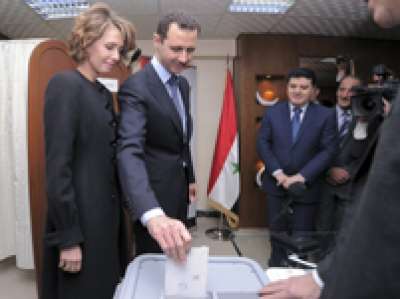 ورافق الرئيس الذي كان يرتدي حلة زرقاء زوجته الأحد بين حشد من الناس الذين كانوا يهتفون له إلى لجنة الاقتراع في دمشق.