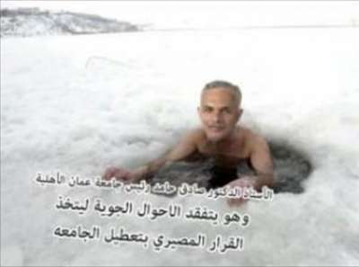 وقال البيان الذي حصلت " خبرني " على نسخة منه الثلاثاء، إن "الطالب قام بتاريخ 1/3/2012 بعمل صورة على صفحته الشخصية على الفيسبوك يظهر فيها رئيس الجامعة غارقاً في الثلوج وكتب على الصورة "الأستاذ الدكتور صادق حامد رئيس جامعة عمان الأهلية وهو يتفقد الأحوال الجوية ليتخذ القرار المصيري بتعطيل الجامعة".