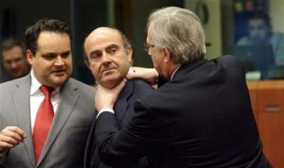 نشرت وكالة أنباء "أسوشيتد برس" أمس، صورة لرئيس وزراء اللوكسمبورغ جان كلود جونكر، يضع يديه على عنق وزير الاقتصاد والتنافسية الإسباني لويس دي غيندوس، فيما وزير مالية هولندا يان كيز دي ياجر، الصورة التقطت خلال اجتماع لوزراء مالية منطقة اليورو في مجلس الاتحاد الأوروبي، لتكشف سخونة المفاوضات التي جرت حول قضايا اليورو.