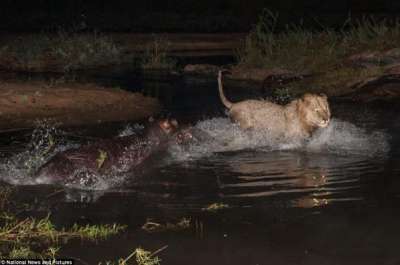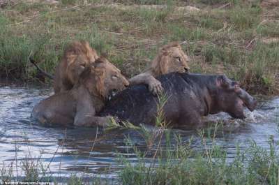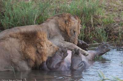 كشف تقرير بالصور عن معركة "حتى الموت" استمرت لساعات بين فرس نهر وأسدين، في محمية "سابي ساندز جيم" بجنوب إفريقيا، استخدم فرس النهر ذكاءه الفطري، فقبع في بركة مياه عميقة، وتحايل الأسدان فكمنا على صخرة قريبة، حتى وقع الخطأ القاتل.