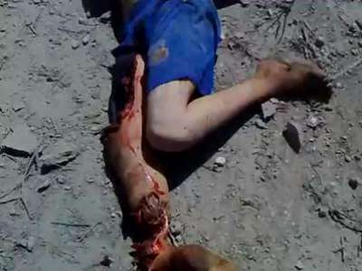 و كأن كلمة يـــا اللــــــــــه تجمّــدت على شفتيه و كأن الأرض تحته تشققت حزناً على جسده الذي صارعته القذائف و طرحته أرضا هذا الطفل في سوريا مات جراء قصف تجمع سكني في الميادين