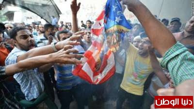 ومساء الثلاثاء، قام محتجون غاضبون في مصر، باعتلاء سور السفارة الأمريكية في القاهرة وتمزيق العلم الأمريكي واستبداله براية سوداء أثناء وقفة احتجاجية للتنديد بعرض فيلم مسيء للنبي محمد بالولايات المتحدة.
