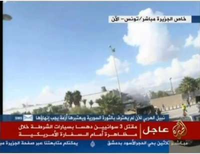 ومشاركة اخرى تقول "اسمعوا هالنكتة: مظاهرة احتجاجية أمام السفارة الامريكية في دمشق." و "ستنتج الولايات المتحدة كل يوم فيلما يسيء لديننا حتى نثور ونحرق سيارات الشرطة والأمن ومن ثم تقوم هي بتوريد سيارات جديدة للشرطة وتنهب اموالنا". وتعليق يقول ايضا " بدي انتج فيلم مسيء بلكن انشهرت".