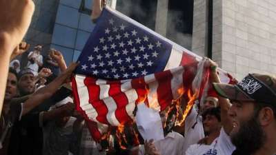 وهتف متظاهرون "لا اله الا الله، امريكا عدو الله" و"يا اميركا لمي فلوسك، بكرا جيش محمد يدوسك"، اضافة الى "لا سفارة اميركية على ارض اردنية" قبل احراق اعلام اميركية.