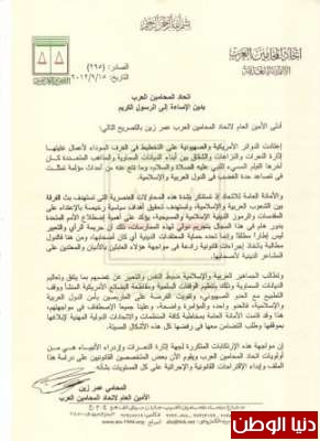 أدلى الأمين العام لاتحاد المحامين العرب عمر زين بالتصريح التالي: