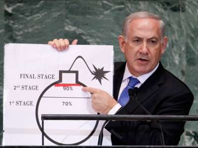 وردا على كلمة رئيس الوزراء الاسرائيلي بنيامين نتنياهو في الجمعية العامة للامم المتحدة قالت بعثة ايران لدى المنظمة الدولية ان اسرائيل وجهت "إتهامات لا اساس لها وسخيفة الي برنامجها النووي الذي يقتصر على الاغراض السلمية."