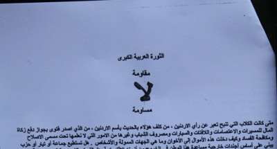 وزعت مجموعة تطلق على نفسها اسم "الثورة العربية الكبرى مقاومة لا مساومة"، منشورات تكشف أرصدة كل من الأمين العام لحزب جبهة العمل الإسلامي حمزة منصور، ونائب مراقب عام الاخوان المسلمين زكي بني ارشيد.