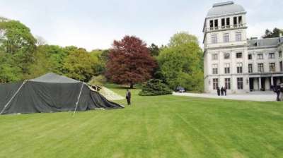 وأشارت المجلة إلى أن محاولات الزعيم الليبي بإقامة خيمة بدوية كمقر إقامة له في نيويورك قوبلت بالرفض بيد أن دونالد ترامب أحد كبار أباطرة تجارة العقارات فى الولايات المتحدة إحتوي الأزمة بسماحه للقذافي بإقامة الخيمة في فناء منزله.