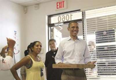 قام الرئيس باراك اوباما مهام مندوب توصيل شطائر البيتزا على نشطاء حملته الانتخابية في مدينة هندرسون بولاية نيفادا