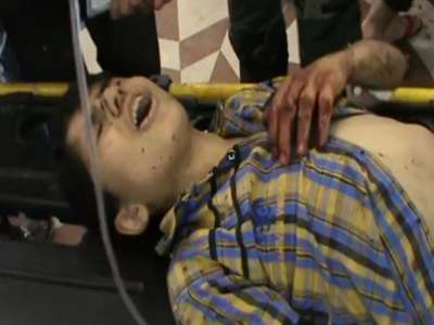 طفل بُترت ساقه و الساق الأخرى مصابة إصابات بليغة يقول مصبّراً نفسه : أشهد أن لا إله إلا الله بعد آهات الألم و دعاء للمسعفين بأن يخففوا عنه هول ما يلقاه قائلاً : الله يوفقكــــــن يا ربّ كن لهذا الطفل و لا تكن عليه يا ربّ لا ملجأ له إلاكَ يا أرحم الراحمين و قد عزّ النصير حسبنا الله و نعم الوكيل حلب - طفل تم قطع ساقه إثر القصف