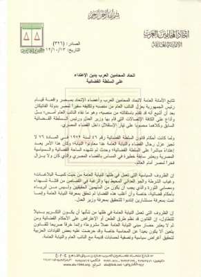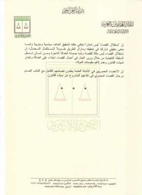 إن الأعضاء المصريين في الأمانة العامة يعلنون تضامنهم الكامل مع النائب العام ورجال القضاء المصري في دفاعهم المشروع عن سياده القانون.