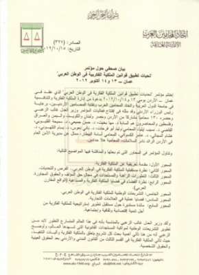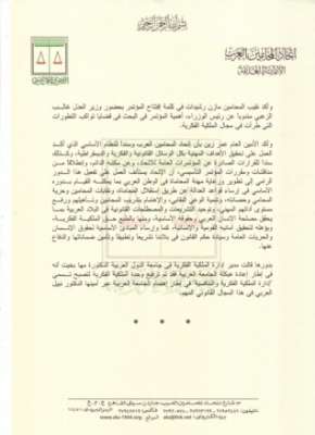 وأكد الأمين العام عمر زين بأن إتحاد المحامين العرب وسنداً للنظام الأساسي الذي أكد العمل على تحقيق الأهداف المهنية بكل الوسائل القانونية والفكرية والديمقراطية، وكذلك سنداً للقرارات الصادرة عن المؤتمرات العامة للاتحاد، وعن مكتبه الدائم، وإنطلاقاً من مناقشات ومقررات المؤتمر التأسيسي، أن الإتحاد