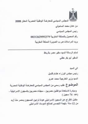 وكان المجلس السياسى للمعارضة المصرية الوطنية الى سفير مصر بالمغرب السيد ابو بكر حفنى والى رئيس مجلس الوزراء السيد هشام قنديل ووزير الخارجية محمد عمرو كطلب رسمى من المجلس السياسى للمعارضة المصرية الوطنية ومبادرة لاستعادة مواطنين مصريين سجناء مصريين بالسجون الاسرائيلية وعددهم 76 سجين مقابل الافراج عن السجين