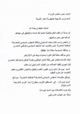 وبعد ثورة 25 يناير وضاف نؤكد التزامنا بالعمل على رفعة الشان الوطنى وخدمة الوطن والمواطن المصرى وقبل شهرين تلقينا اتصالات من الجانب الاسرائيلى من مكتب السيد ايوب قرا نائب وزير تطوير النقب والجليل والتعاون الاقليمى وعضو الكنيست عن حزب الليكود ووفق منعلومات المجلس السياسى للمعارضة المصرية سيرشح السيد ايوب قرا فى المستقبل القريب