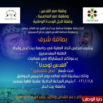 " القدس توحدنا " حراك شبابي ينتقل الى محافظة بيت لحم الخميس المقبل