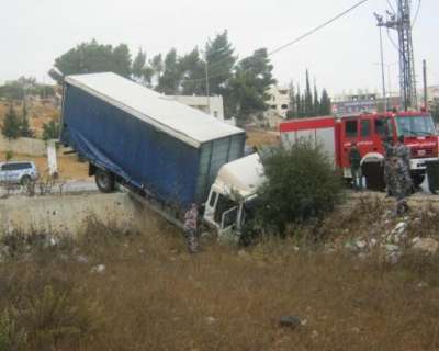 مع حادث سير إنزلاق وإنحراف مركبة شحن عن مسارها وسقوطها جانب شارع القدس الخليل في بلدة الخضر غرب بيت لحم .