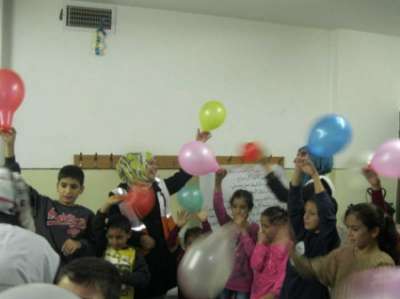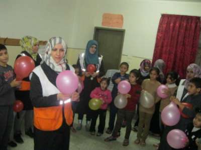 والرسم على رولات الورق وشد الحبل والدببة وغيرها، بإشراف الأخصائية إيمان نزال ومجموعة من المتطوعين والمتطوعات.